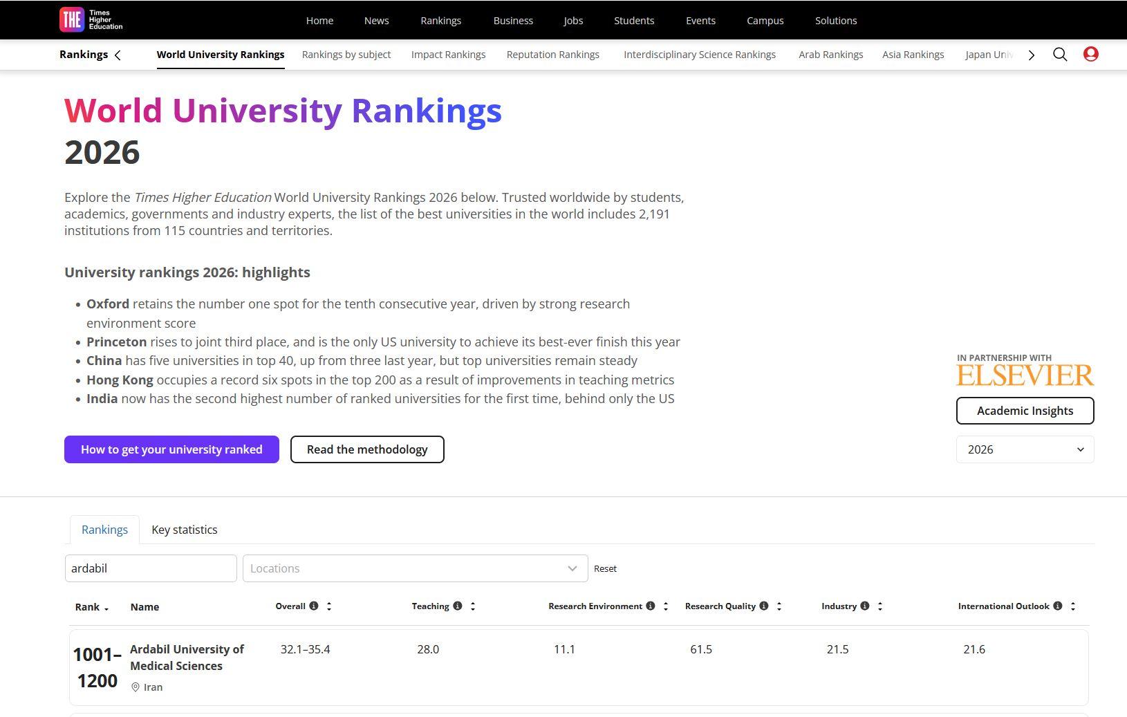 قرار گرفتن دانشگاه علوم پزشکی اردبیل در نظام رتبه بندی تایمز ۲۰۲۶ برای اولین بار